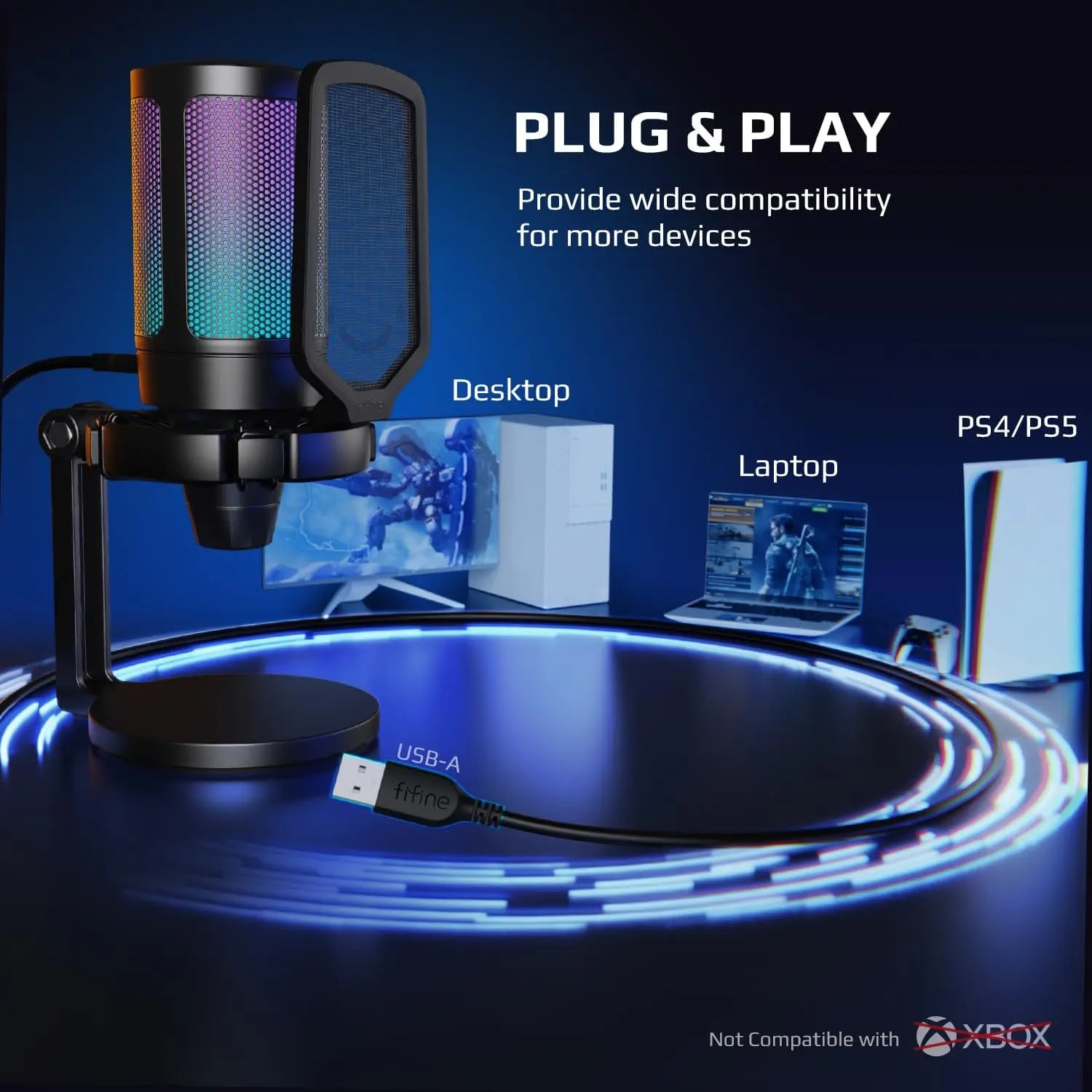 AmpliGame by FIFINE USB Gaming Microphone with RGB,Gain Knob,Touch Mute,Streaming Podcast Condenser Mic for PC,Switch,PS5-A6NEO